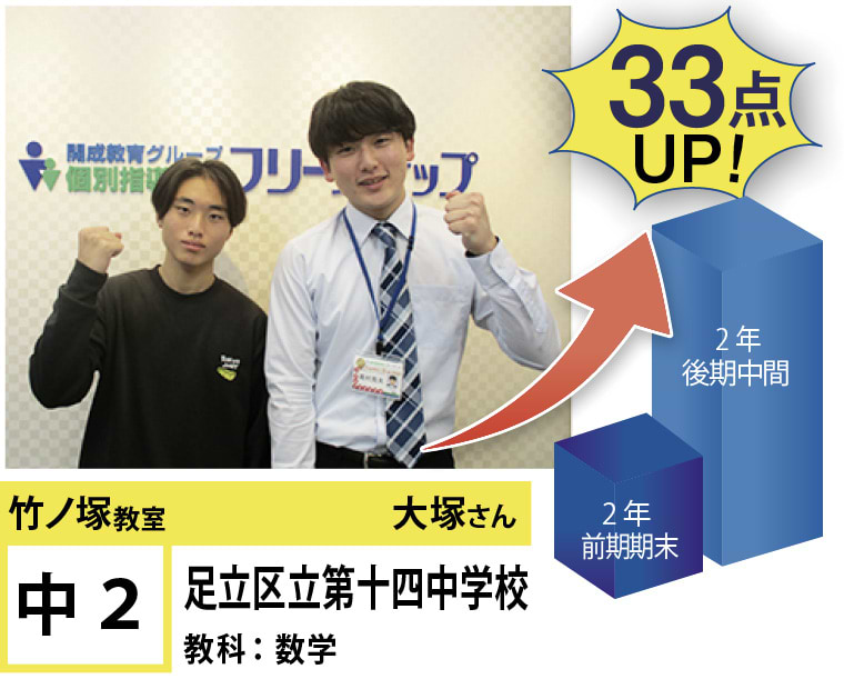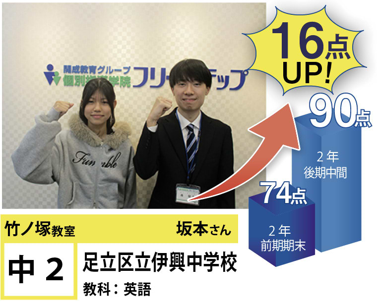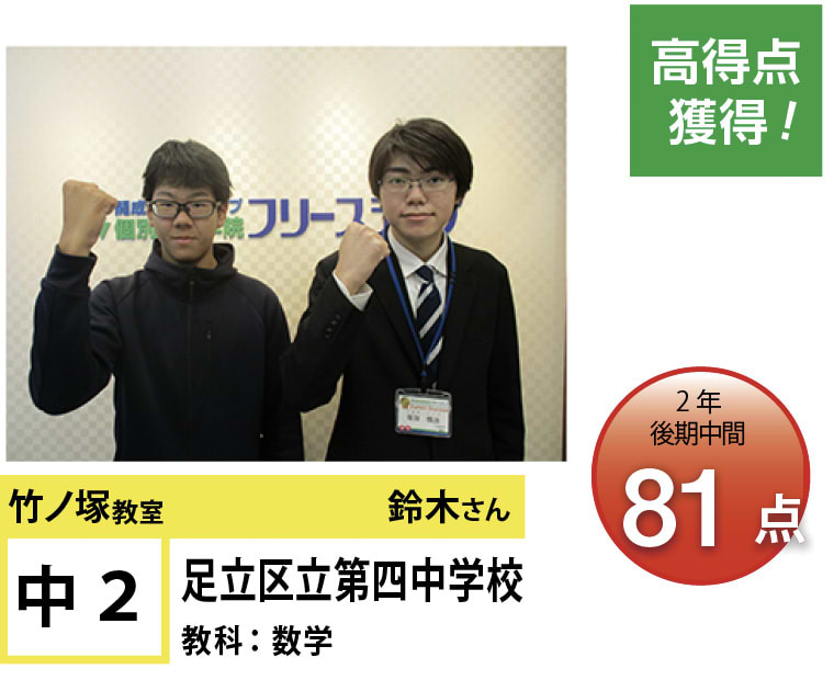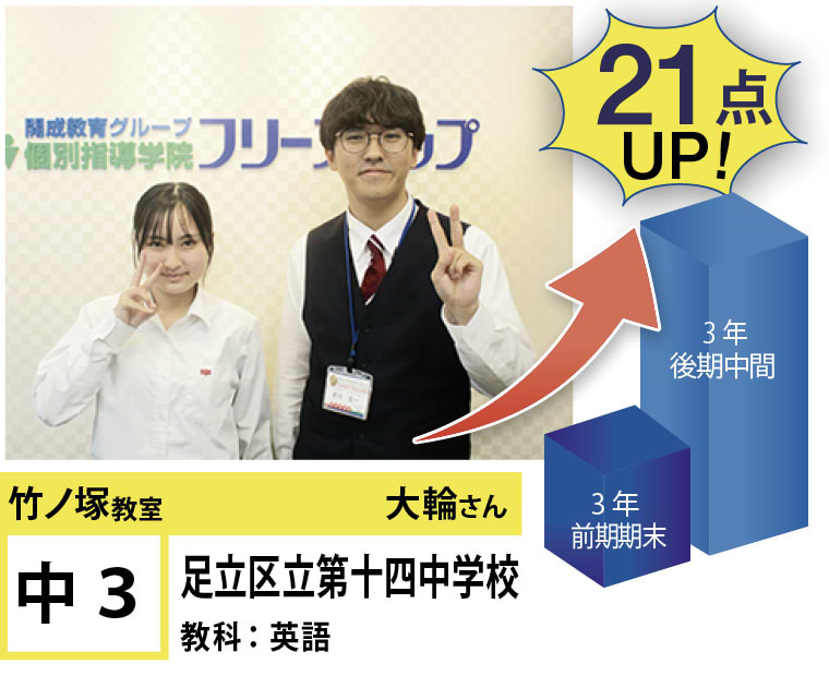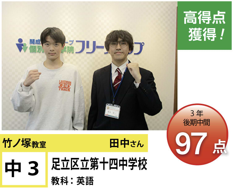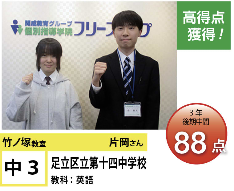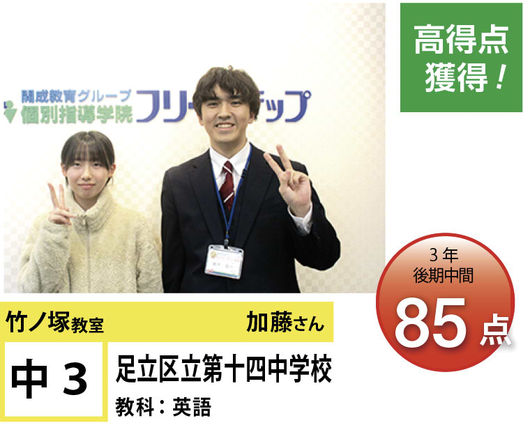 個別指導学院フリーステップ竹ノ塚教室は、「点数アップに強い大学受験に強い個別指導」として、これまで多くの点数アップを実現しました。竹ノ塚教室では、地域のお子さま方の「自立」のお手伝いをさせていただきたいと思います。一人ひとりに合わせたテストまでのカリキュラムを設定し、毎回の授業で理解度テストを実施、テスト直前対策ゼミを行い、目標点達成に向けて学習を進めていますので、計画的に学力向上が目指すことが可能です。