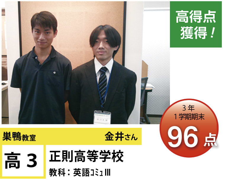 | 在籍生徒 | 小学校・・・駕籠町小学校、仰高小学校、滝野川小学校、立巣鴨小学校、立林町小学校、立朝日小学校 など 中学校・・・鴨北中学校、第十中学校、駒込中学校、筑波大学附属中学校、暁星中学校、雙葉中学校 など 高校・・・東広尾学園高等学校、富士見高等学校、明治大学付属中野高等学校、学習院女子高等科高等学校、高輪高等学校、井草高等学校 など |