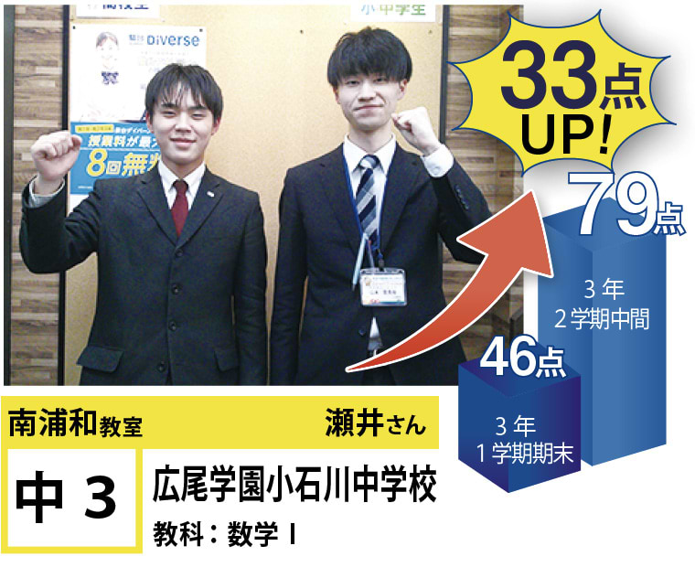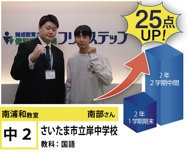 フリーステップ南浦和教室は、講師や学習プランナーの「考動」をもってお子様を「点数アップ」や「受験合格」に導きます。南浦和教室の自慢の講師は、1:2の授業を通してお子様を「わかる」から「できる」にするための一人ひとりにあった指導方法を考え抜き、実践します。講師の絶え間ない考動によって、南浦和教室には多くの点数アップ事例や合格実績があります。また、お子様の現状と無限大の伸びしろを踏まえ、学習プランナーが最適な学習メソッドを考案し、お子様と保護者様にご納得いただける進路指導をいたします。そして、フリーステップの強みであるシステムを利用し、お子様一人ひとりに合わせたカリキュラム作成を行い、ご自宅での家庭学習もサポートさせていただきます。