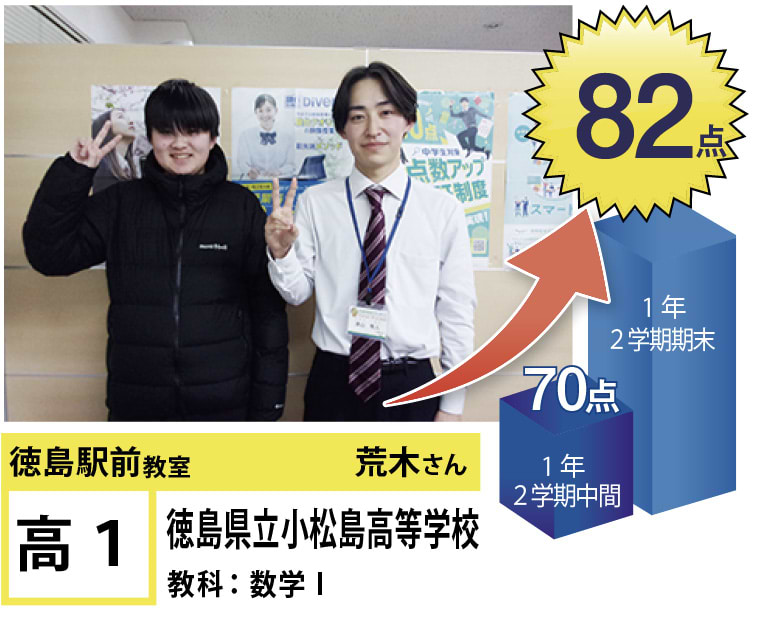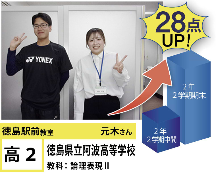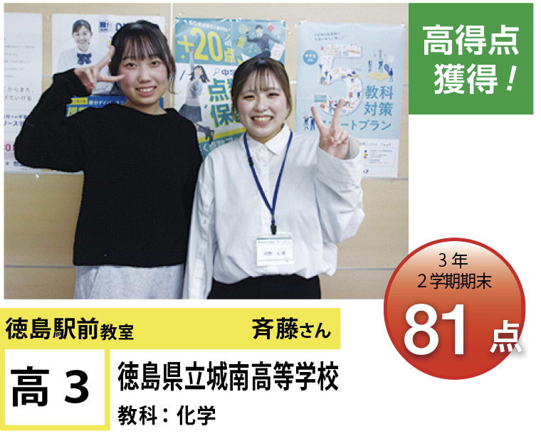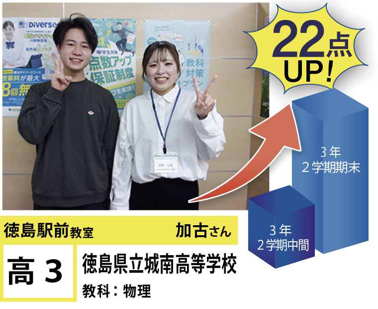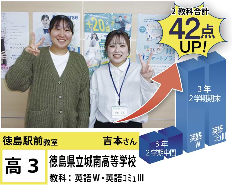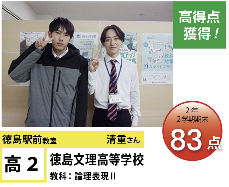| 在籍生徒 | 小学生・・・内町小学校、佐古小学校など 中学生・・・城西中学校、徳島文理中学校、加茂名中学校、城ノ内中等教育学校、富田中学校、徳島中学校など 高校生・・・城東高等学校、高等学校、城南高校、城北高校、城ノ内高校、徳島文理高等学校など |
