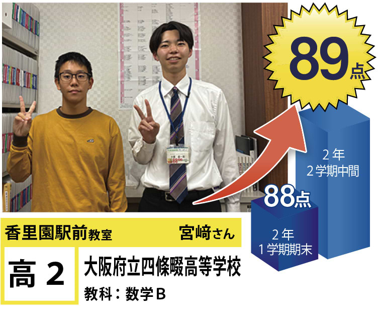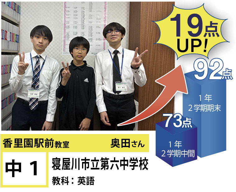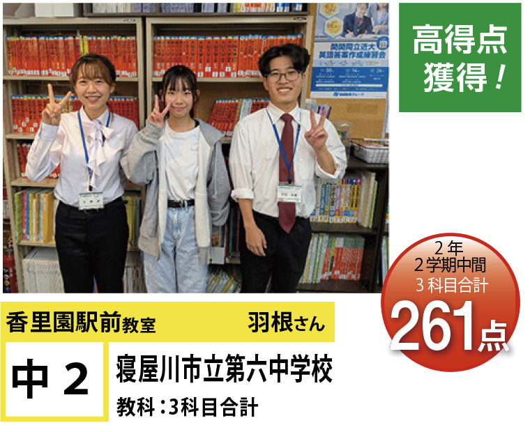 | 在籍生徒 | 小学生・・・香里小学校、東香里小学校、第5小学校、北小学校、追手門学院小学校、香里ヌヴェール学院小学校など 中学生・・・第6中学、第3中学、友呂岐中学、第2中学、第4中学、東香里中学など 高校生・・・寝屋川高校、牧野高校、市立高校、香里丘高校、同志社香里高校、香里ヌヴェール学院高校など |