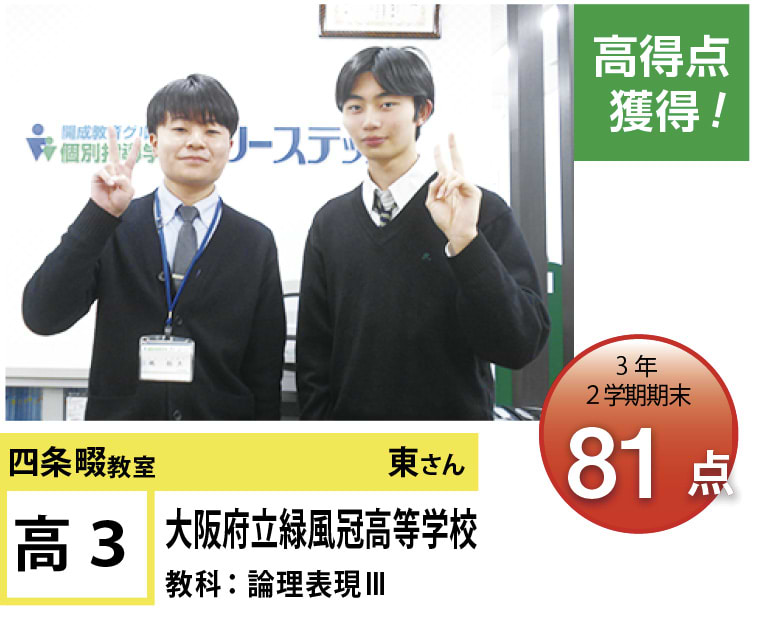 | 在籍生徒 | 小学生・・・くすのき小学校、四條畷小学校、堀溝小学校、北条小学校、四条北小学校、四條畷学園小学校 など 中学生・・・四條畷中学校、深野中学校、四條畷西中学校、北条中学校、田原中学校、四條畷学園中学校 など 高校生・・・大阪市立東高等学校、大阪府立交野高等学校、大阪府立枚方高等学校、大阪桐蔭高等学校、四條畷学園高等学校、常翔啓光学園高等学校 など |