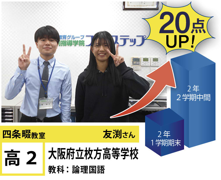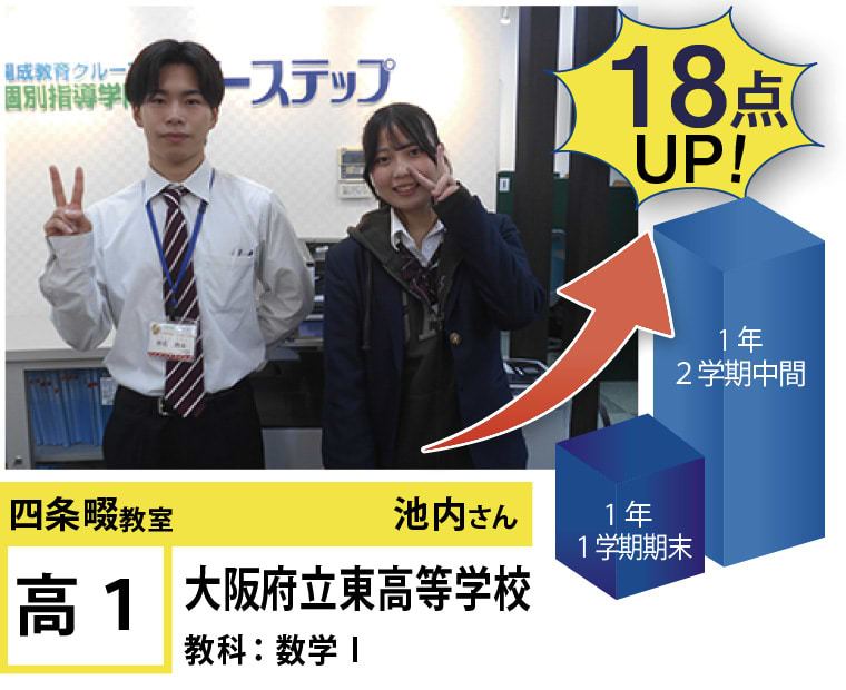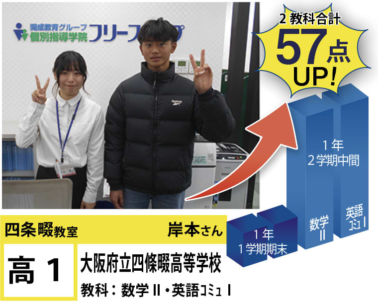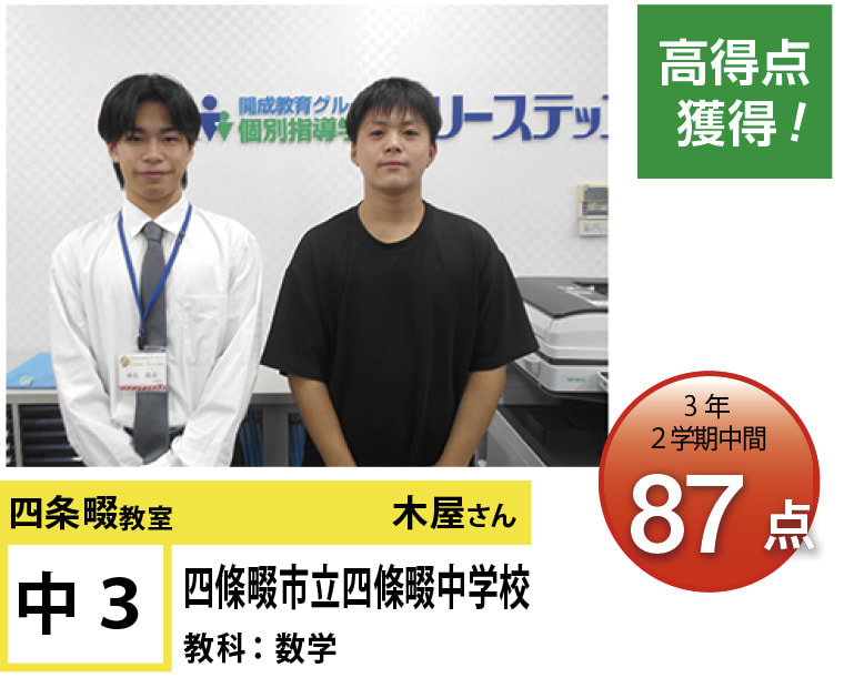 こんにちは!四条畷教室の嶋と申します。私たちは学校でのテストの成績向上はもちろん、受験のための実力向上に特に力を入れて指導しています。お子さま一人ひとりとしっかりと向き合い、目標から逆算して、個別にカリキュラムを考えていくことで成果に繋げています。