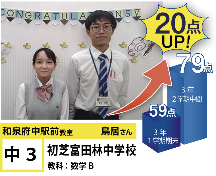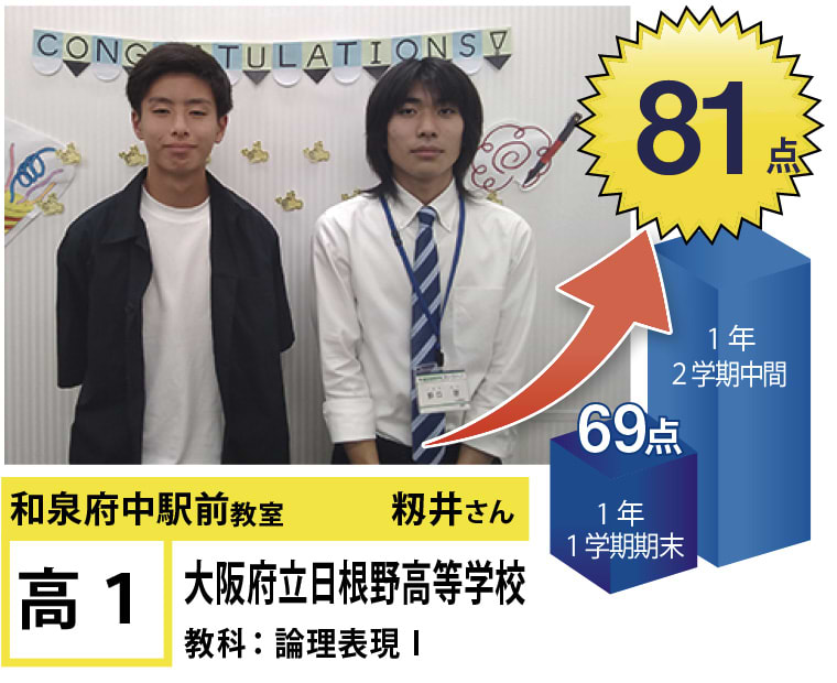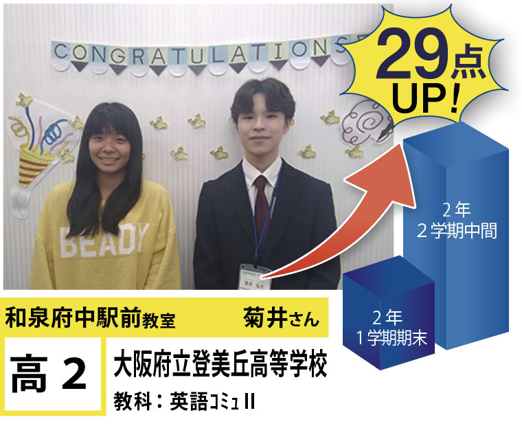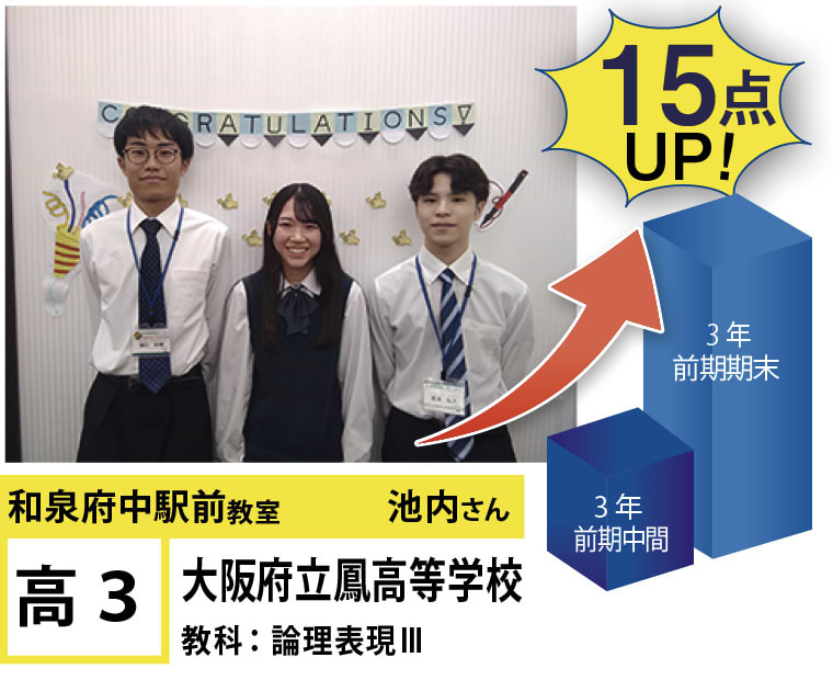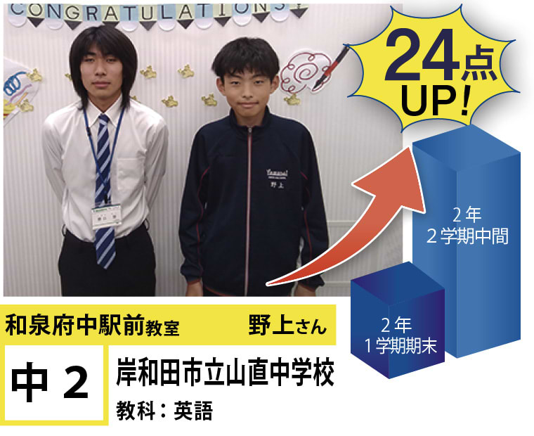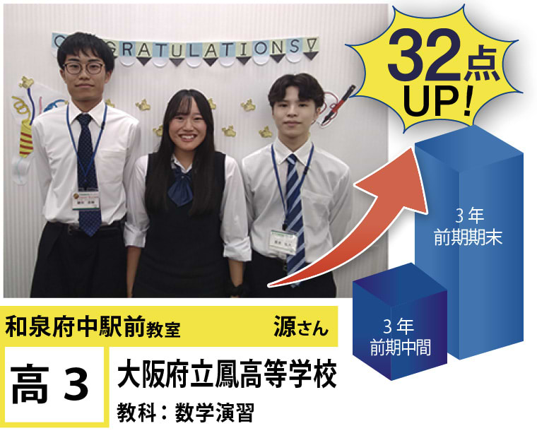 | 在籍生徒 | 小学生・・・黒鳥小学校など 中学生・・・和泉中学校、石尾中学校、富秋中学校、郷荘中学校、帝塚山学院中学校など 高校生・・・鳳高等学校、泉北高等学校、浪速高等学校、泉大津高等学校、賢明学院高等学校など |
