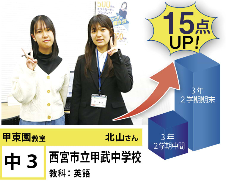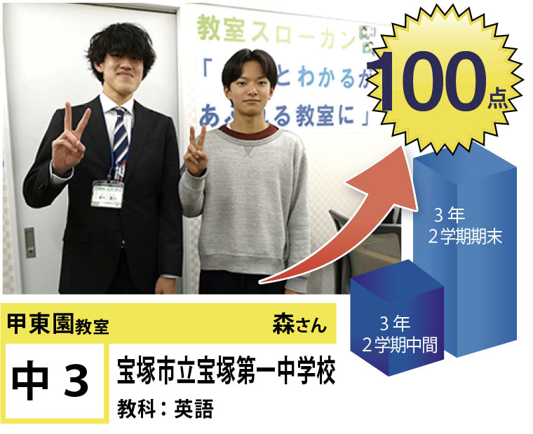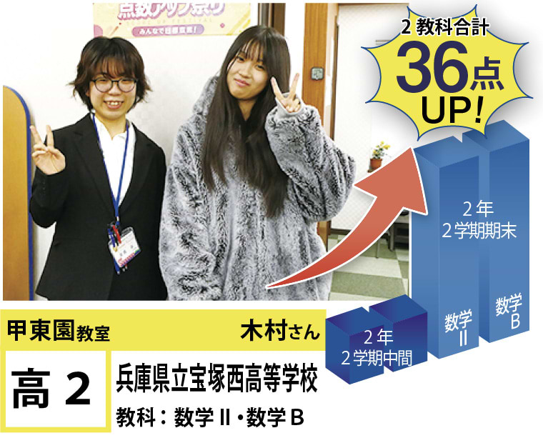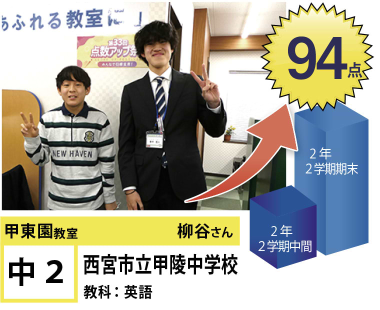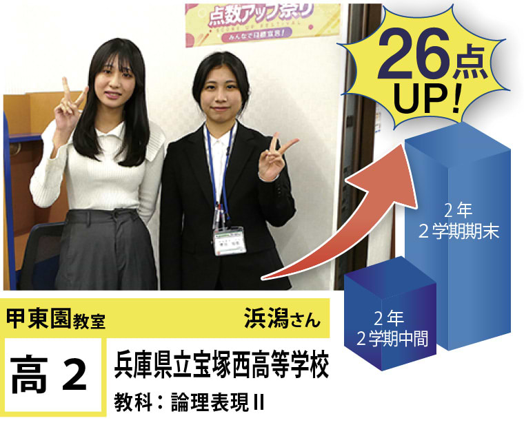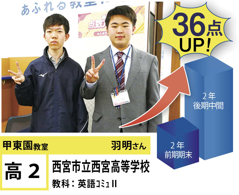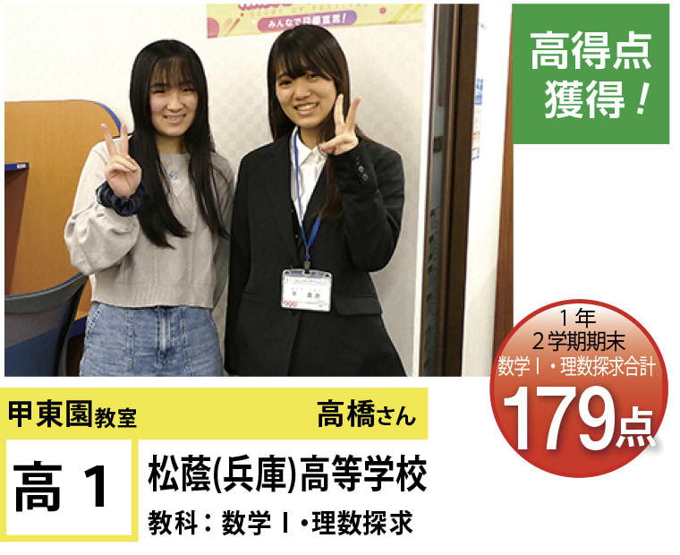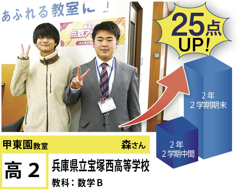 | 在籍生徒 | 小学生・・・甲東小学校、段上西小学校、上ヶ原小学校、など 中学生・・・甲陵中学校、甲武中学校、上ヶ原中学校、宝塚第一中学校、関西学院中学部、報徳学園中学校、など 高校生・・・市立西宮高校、宝塚北高校、西宮東高校、県立西宮高校、宝塚西高校、仁川学院高校、など |