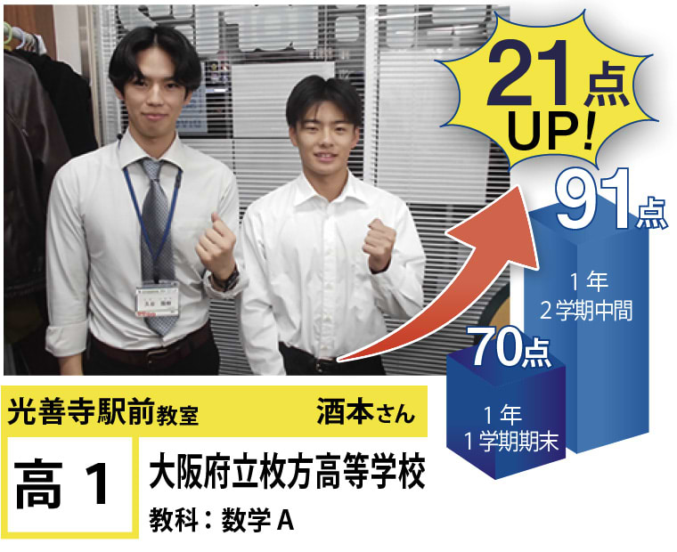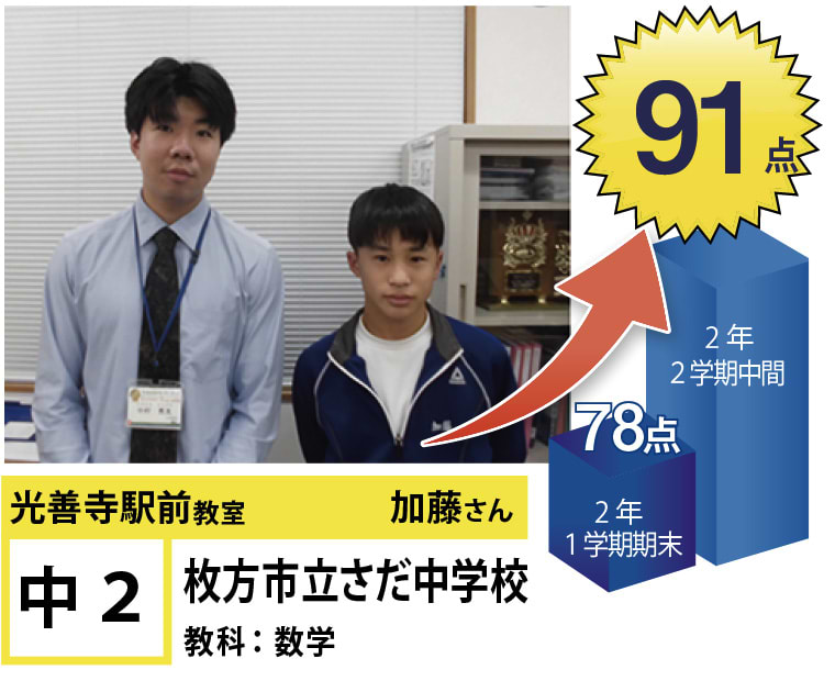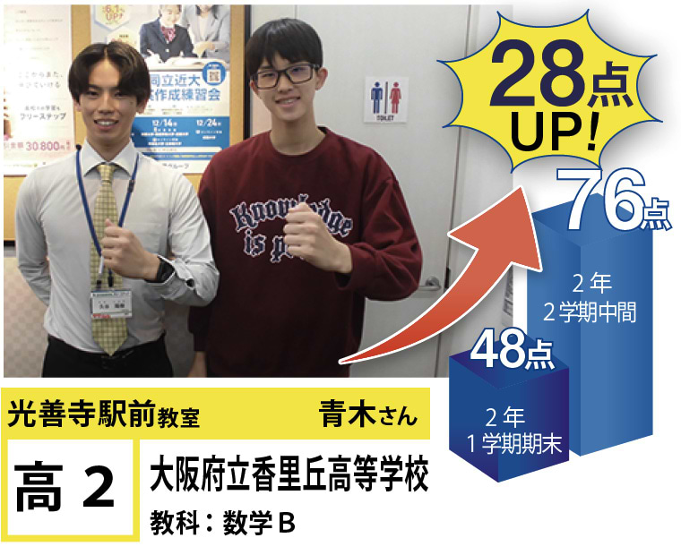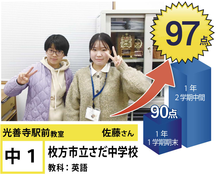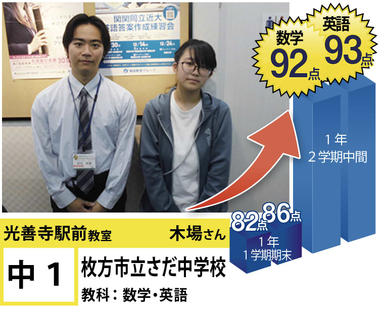 | 在籍生徒 | 小学生・・・蹉だ東小学校、伊加賀小学校など 中学生・・・蹉だ中学校、第四中学校など 高校生・・・いちりつ高等学校、香里丘高等学校、大手前高等学校、牧野高等学校、大阪国際高等学校、同志社女子高等学校など |