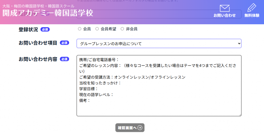 下記ボタンをクリックし、お問い合わせ項目の『グループレッスンのお申込みについて』を選択。