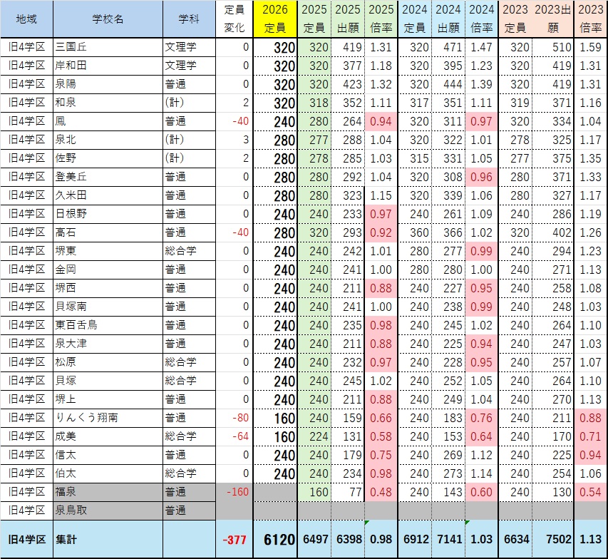 いずれも昨年度は定員割れとなった鳳、高石、りんくう翔南、成美の4校はいずれも定員減となります。定員160だった福泉が募集停止となりますが、地域としての定員減は約360名、9クラス分となっています。