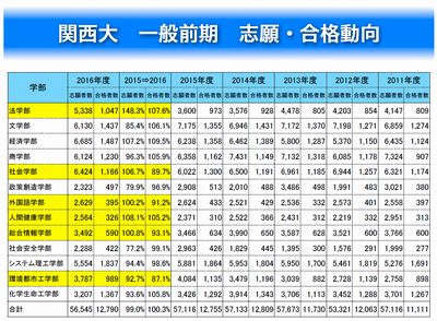 さて、今年度の関西大の入試はどのような状況になっているのか、ここで詳しく見てみたいと思います。下の表は、過去6年間の学部別志願・合格動向を表したものです。一般入試のみを対象として表を作成おり、センター利用型については割愛しています(画像をクリックすると拡大します)。
