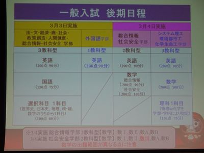 一般後期は、3/3木に文系学部、3/4金に理系学部、3/3・4の両日では文理融合型である総合情報と社会安全の2学部、がそれぞれ試験を実施されます。