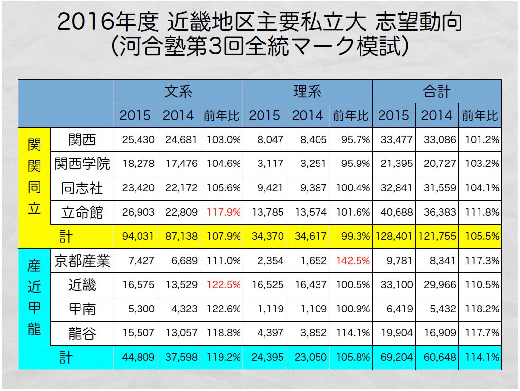 今回のエントリーでは、近畿地区を代表する関関同立・産近甲龍の志望動向という、前回ご紹介した分析よりももう少しミクロかつローカルな視点で志望動向をお知らせします。
