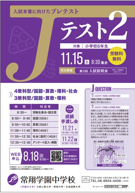 人気急上昇中の常翔学園中学校、今年も「Jテスト」と呼ばれるプレテストが年に2回行われますが、11月15日がいよいよ2回目、つまり最終回となります。