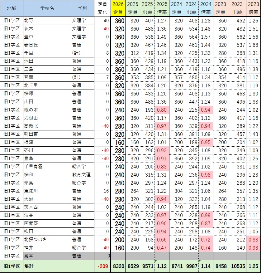 北野が1クラス増、茨木が1クラス減。2023年度に戻った感じでしょうか。茨木はかなりの高倍率になるかも・・・。