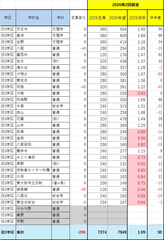 旧3学区では定員を約200名減少に対し、公立希望者が昨年と比べて増加しています。上位校はどうやら今年も厳しい戦いとなりそうです。隔年現象でしょうか、夕陽丘の希望者が昨年より大きく減少しています。部活も含めて元気な河南も含めて狙い目となるかも。結構学校間の差が大きいようですので、今後の希望調査も要注目です。