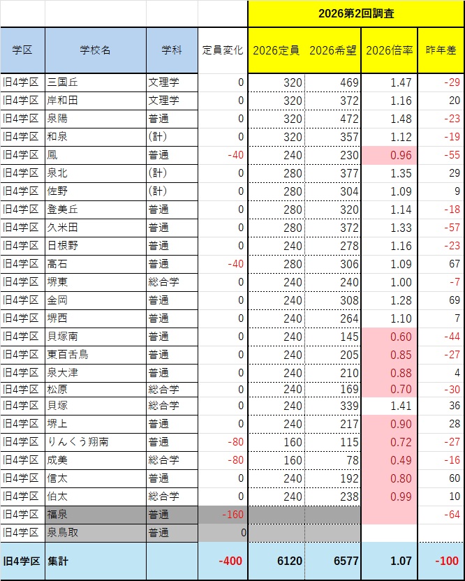 旧4学区も、定員減少が400だったのに対し、希望者の減少が100名に留まっていますので、平均倍率も上がっています。中堅校では1~1.3倍と落ち着いた倍率になっており、ここから大きな変動はないかも知れません。