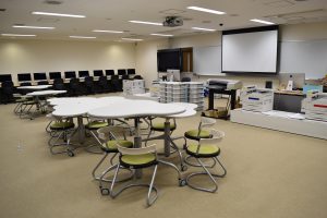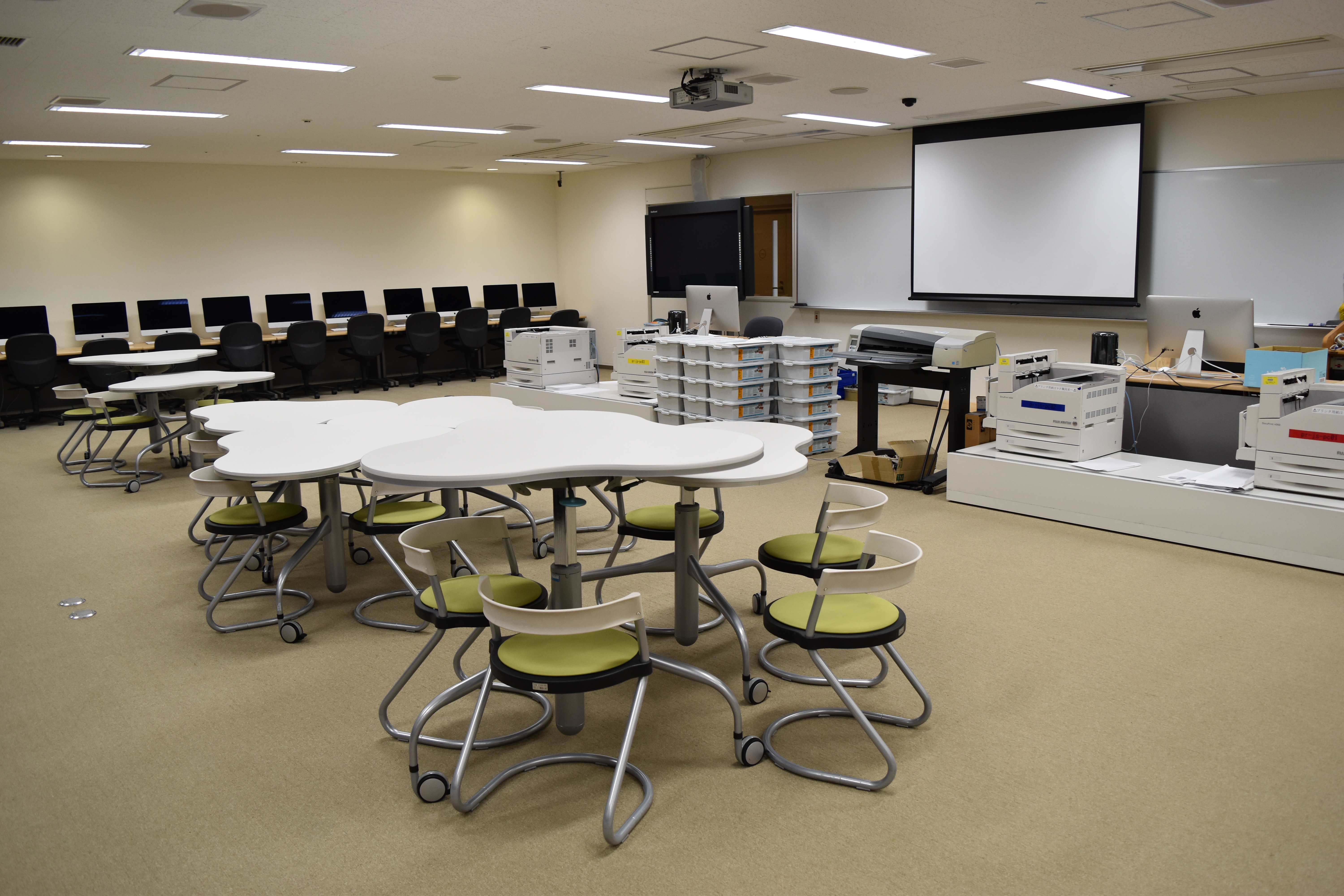 職員室はガラス張りで、向かい側が保健室となっており、その出入りが常に見えるようになっています。