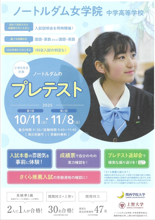 今回紹介するのは京都のノートルダム女学院中学校のプレテストです。2日程用意されていますので、どちらかを受験すればいいのですが、これほど恵まれた学習環境、教員組織が用意されている学校は貴重ですので、合格を確実にするためにもできれば2回受験することをお勧めします。