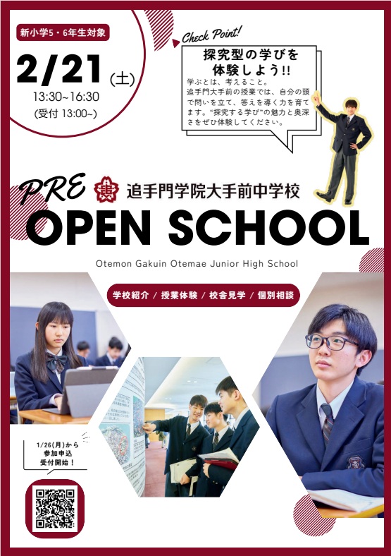 中学入試が終わり、私立高校入試も終わり、関関同立の一般選抜も終わってホッとしているところに追手門学院大手前中学校からオープンスクールのご案内をいただきました。教職員の皆さんも入試や年度末でお忙しいまっ最中だと思いますが、授業体験や個別相談をしていただけるようです。先生方頑張りすぎです。