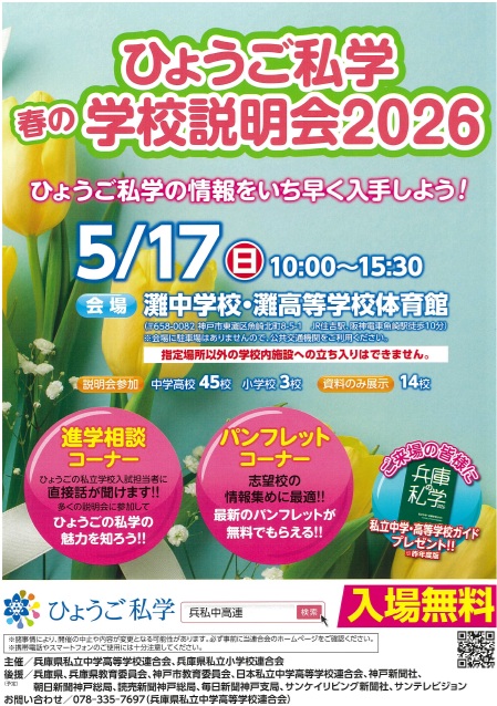兵庫県の私学が5月に合同説明会を開催します。参加予定は中高45校、小学校3校だそうです(HPで確認すると、そこからは増えていないようです)。主催は兵庫県私立中学校高等学校連合会、兵庫県私立小学校連合会ですが、新聞社各社が後援に付くなどなかなか万全の体制です。