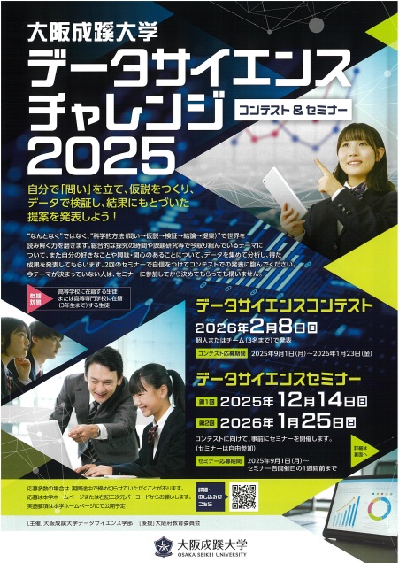 阪急京都線相川駅近くの大阪成蹊大学にはデータサイエンス学部がありますが、この分野にも、もっと多くの高校生に関心を持ってもらおうということでしょうか、この大学の先生だけではなく、外部の先生方を審査員に招いてのコンテストが2026年2月8日に開催されます。出場するのは個人でもグループ(3名まで)でも良いらしいのですが、身の回りの様々なデータを掛け合わせた分析と、その利用方法などを5分以内のプレゼンで競う、というものです。
