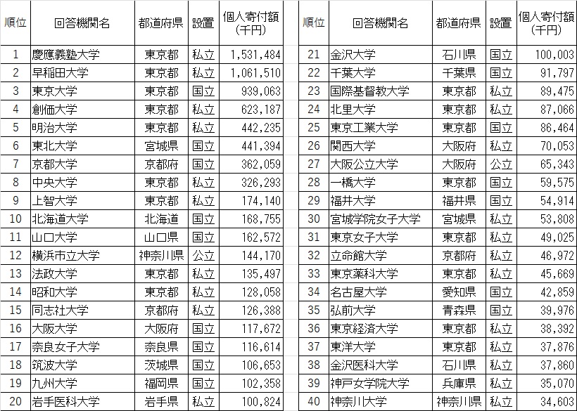 ベスト40の中では東京の大学が17件なのに対し、京都府、大阪府はそれぞれ3件です。東京は強いなぁ。大学の規模によっては、数千万円というのはそれほど大きな金額ではないかもしれませんが、これだけ個人による寄付が集まっているということは、卒業生も含めて社会からの支持を得ているということでしょう。