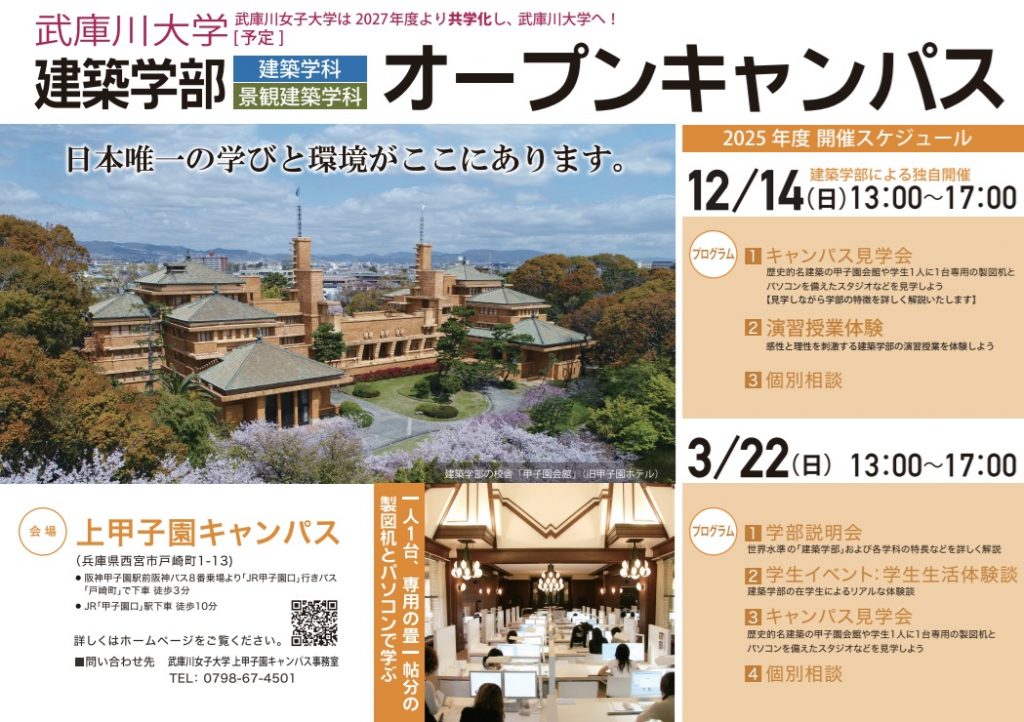 武庫川女子大学が共学化する話は以前このエントリーでも紹介しましたが、いよいよ本格始動となります。今回は12月に行われる建築学科のオープンキャンパスの紹介です。