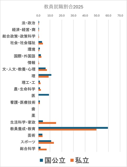同じように教員についても数値をまとめてみました。大学で教職課程の単位を取れば教育学部卒業でなくても教員免許は取得できますので、あまり差が無いと思っていたのですが、おお?