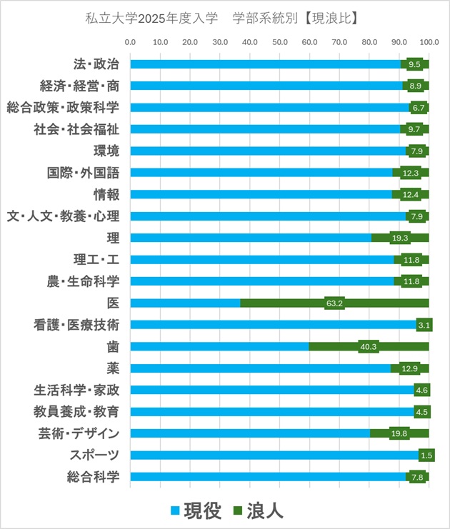 大手予備校に多くの既卒生(浪人)があつまり、人気講師の授業には他のクラスからの「モグリ」も含めて1部屋に200名ほどの受講生であふれかえっていたのは昔のこと。特に受験機会の多い私立大学に関しては現役で入学する学生が大半となっています。最難関の国立を狙うのならさておき、私立大学では、既卒生は少数派だよね、という説を検証します。