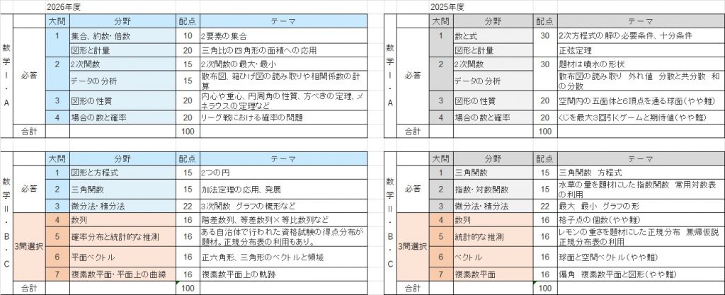 数学に関しては、これまた昨年とほぼ同じ構成になりました。数Ⅱ・B・Cは4題から3問選択という形もそっくりです。