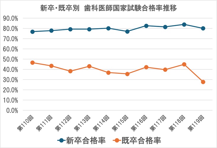 歯科医師国家試験の結果も厚生労働省から発表されています。昨年3月にこのブログで紹介したときは久しぶりには久しぶりに合格率7割台を回復、と書きましたが、今年は61.9%と厳しい結果になりました。因みに新卒の合格率は80.2%ですが、既卒は4割~2割程度と大きく開いており、その差は年々大きくなっています。なかなか、厳しいですね。