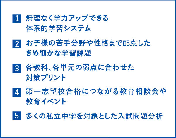 右の5つの方針を大切にし、生徒一人ひとりの個性や性格に合わせた「きめ細やかな受験指導」を実践しています。