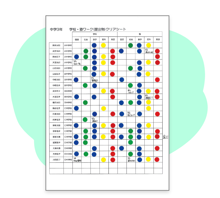ワーククリアシートを使用し、担当教員全員が、生徒一人ひとりの定期テスト対策用の5科目のワーク・学校のワークの進捗状況を点検し、わからないところの質問受けも随時行います。