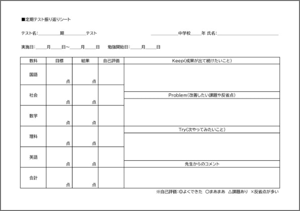 結果が出た後は、すぐに得点を集約し、次のテストへ向けて頑張れるよう、定期テスト振り返りシートを活用し、今回のテストの経験を次回に活かします。