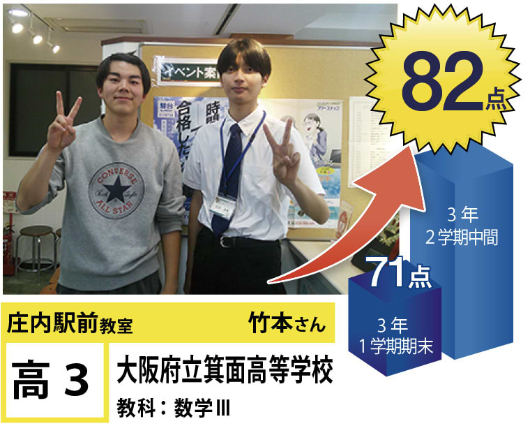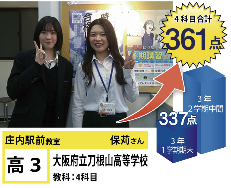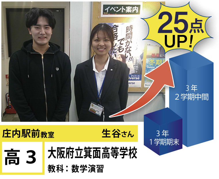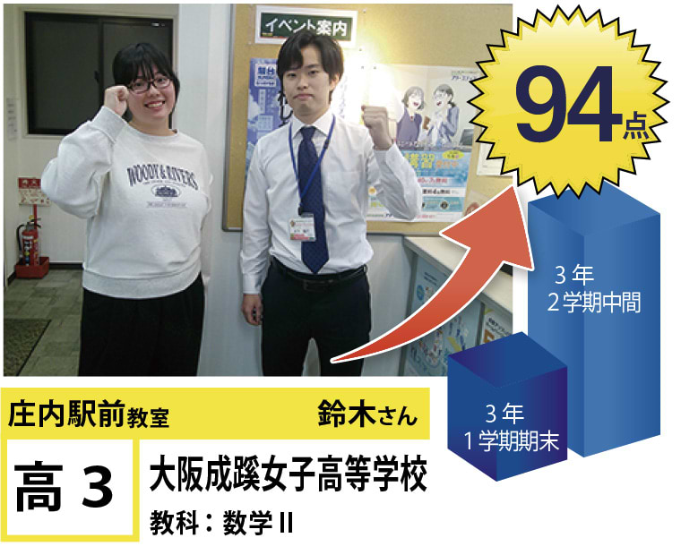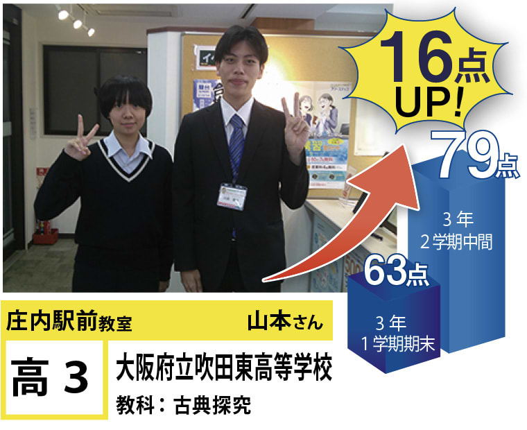 | 在籍生徒 | 小学校・・・吹田南小学校、千成小学校、雲雀丘学園小学校など 中学校・・・庄内さくら学園、第七中学校、百合学院中学校、関西大学北陽中学校など 高校・・・池田高等学校、箕面高等学校、刀根山高等学校、茨木高等学校など |