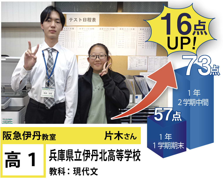 個別指導学院フリーステップ阪急伊丹教室は、「点数アップに強い大学受験に強い個別指導」として、これまで多くの点数アップを実現しました。そのノウハウを活かし、阪急伊丹教室では、地域のお子さま方の「夢の実現」のお手伝いをさせていただきたいと思います。一人ひとりに合わせたテスト・受験までのカリキュラムを設定し、毎回の授業で理解度テストを実施して日々の学習をサポート、目標点達成に向けて学習を進めていますので計画的に学力向上が目指すことが可能です。