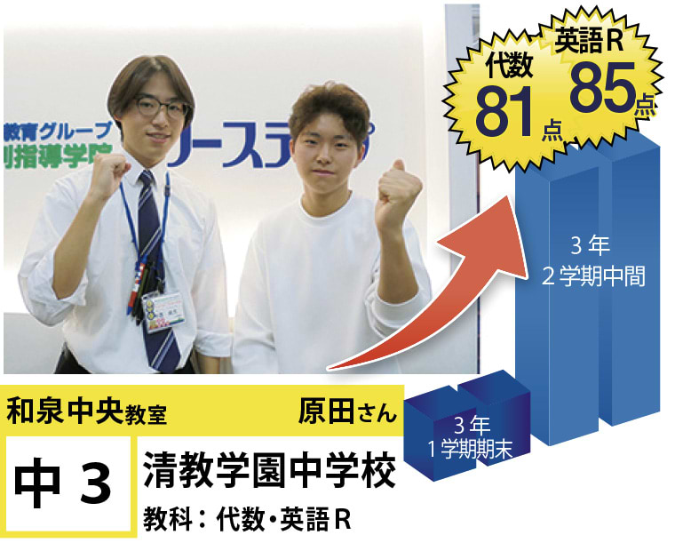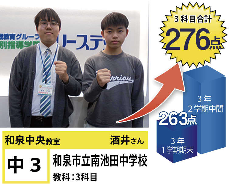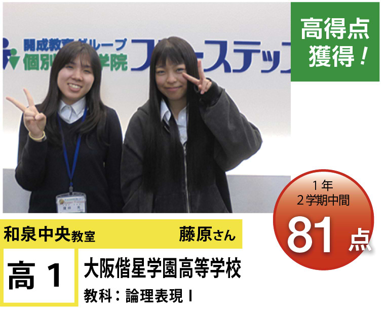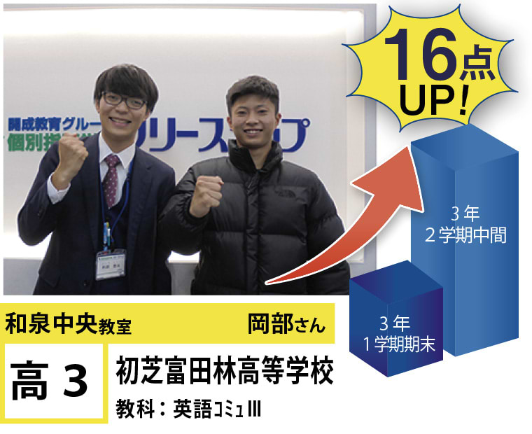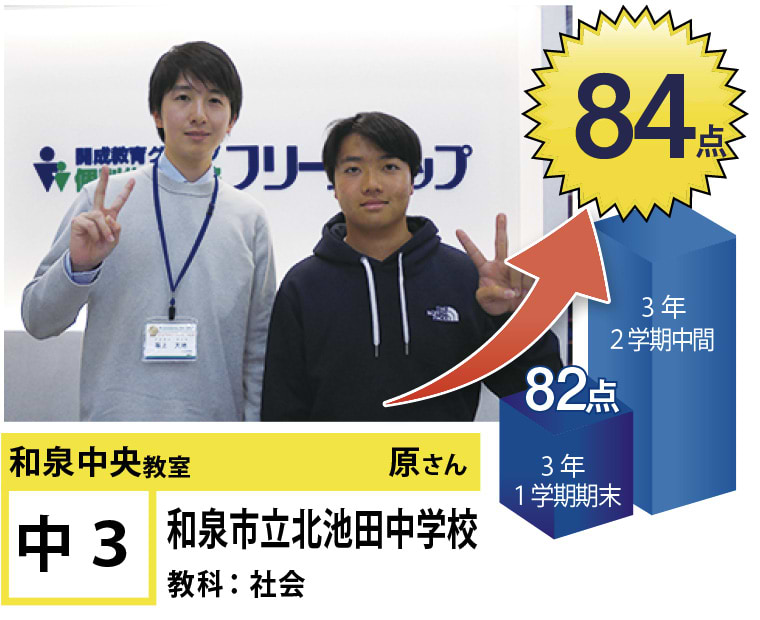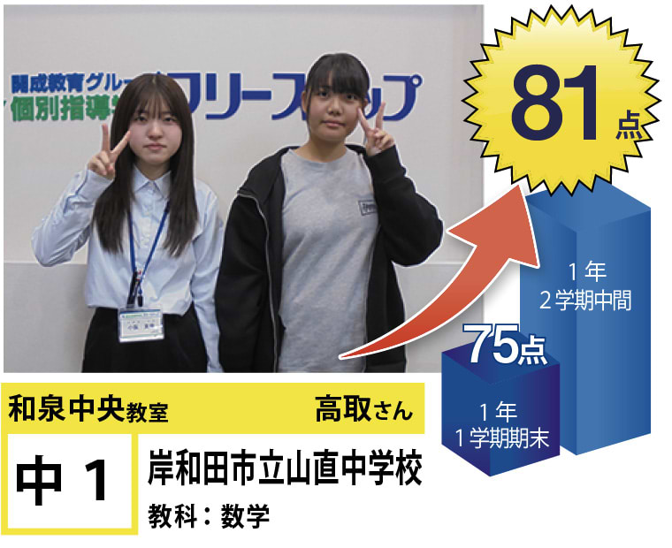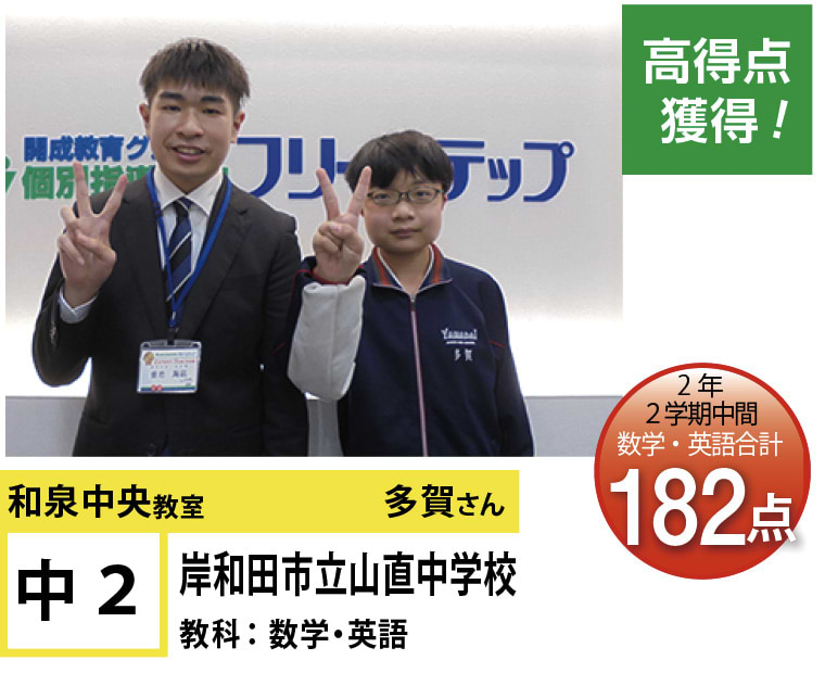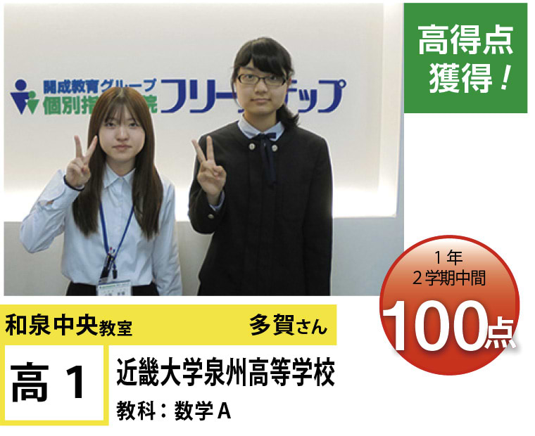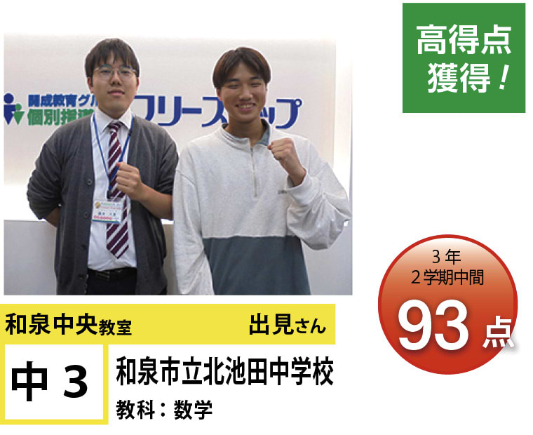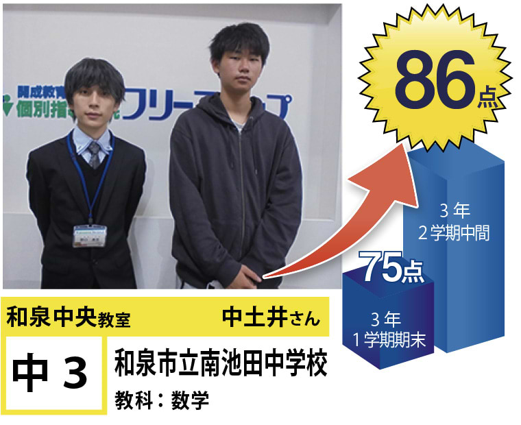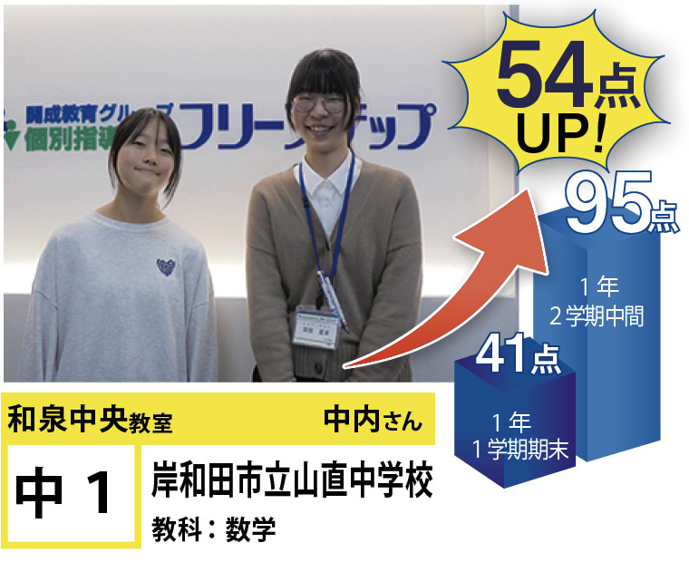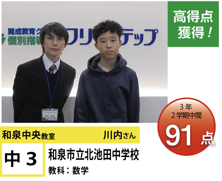 「何のために勉強しているのかわからない。」「受験勉強しないといけないのはわかっているけど、身が入らない。」「将来こんな仕事したい。こんな大学(高校)に行きたいけど、自分には無理。」このような悩みを抱えている小学生・中学生・高校生は、ぜひフリーステップ和泉中央教室に一度お越しください。中学校のテストで平均点を取れなかったり、学校の先生からは「志望高校への進学は難しいかもしれない。」と言われていた生徒が第1志望の高校に合格できたりと、みなさんの普段の時間の使い方、勉強方法、結果の出る学習方法と計画をお伝えします。途中で挫折しそうになったら、教室スタッフ全員が全力でサポートし牽引します。身近に遊べる環境が整っている中で、受験勉強や日々の勉強を行うことは大変ですが、目標を達成した時の喜びは最高です。「やり方を変えて結果を変える」をモットーにみなさんと一緒に全力で熱意を持った指導を行います。是非、和泉中央教室で夢や目標を叶えましょう。