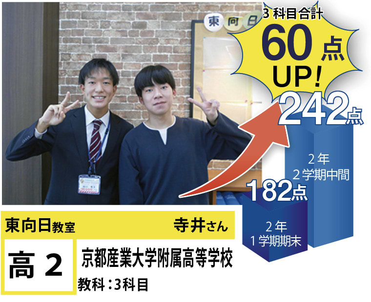| 在籍生徒 | 小学校・・・第四向陽小学校、立命館小学校など 中学校・・・神川中学校、寺戸中学校、西ノ岡中学校、勝山中学校、大原野中学校、立命館小学校など 高校・・・桂高等学校、鳥羽高等学校、京都成章高等学校、開建高等学校、桃山高等学校、日吉ヶ丘高等学校など |