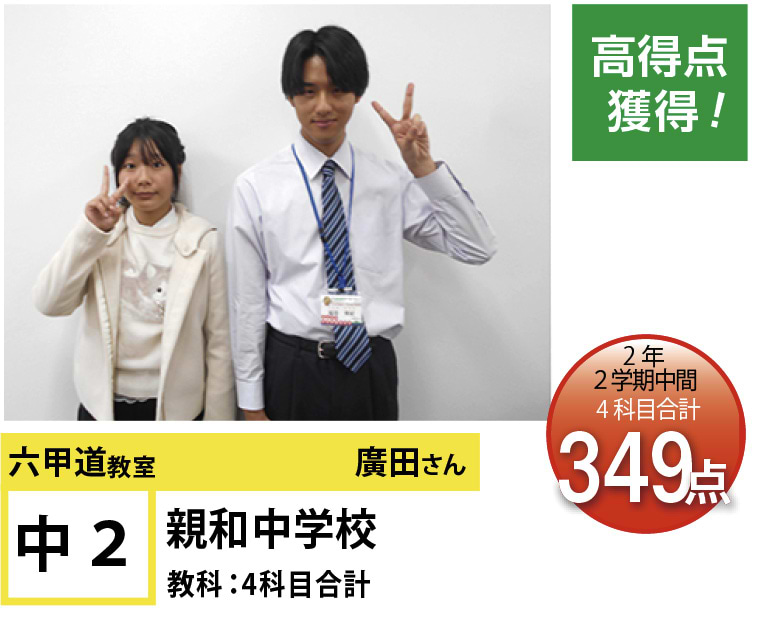 | 在籍生徒 | 小学校・・・成徳小学校、西郷小学校、六甲小学校、高羽小学校、灘小学校など 中学校・・・烏帽子中学校、鷹匠中学校、原田中学校、御影中学校など 高校・・・御影高等学校、葺合高等学校、芦屋高等学校、六甲アイランド高等学校、北須磨高等学校、東灘高校など |