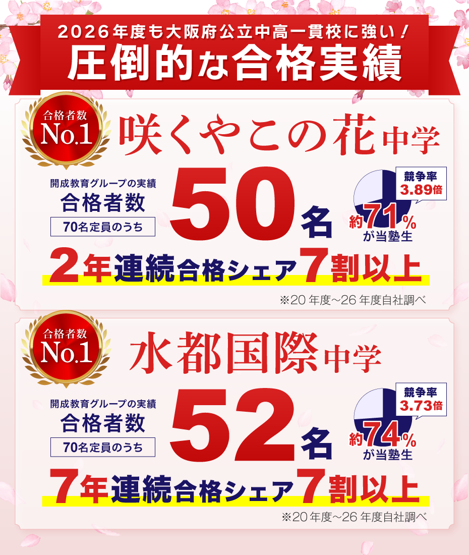 ※開成教育グループ(開成教育セミナー、個別指導学院フリーステップをはじめとする(株)成学社が運営する教室及びフリーステップFC教室)は、公益社団法人全国学習塾協会が制定した基準(及び同実施細則)に従い、合格実績として集計しています。合格者数は、開成教育グループ受講生の合計です。