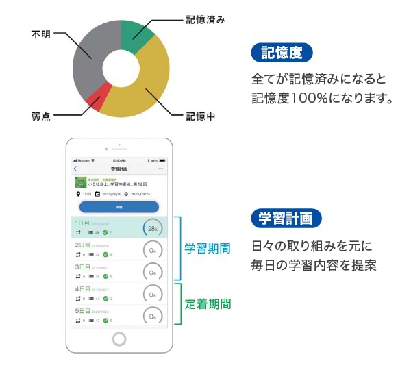 (モノグサ)塾での学習のみならず、家庭でも自分のタイミングで学習内容の確認をすることで、より内容の定着が深まります。 家庭学習用ツール「Monoxer」は、一人ひとりの記憶に合わせて問題を出題し、記憶の定着をサポートするAI搭載の学習アプリです。 今まで可視化することが難しかった「記憶の進捗状況」を可視化することで効果的な記憶の定着を図り、最適な学習計画をご提案します。